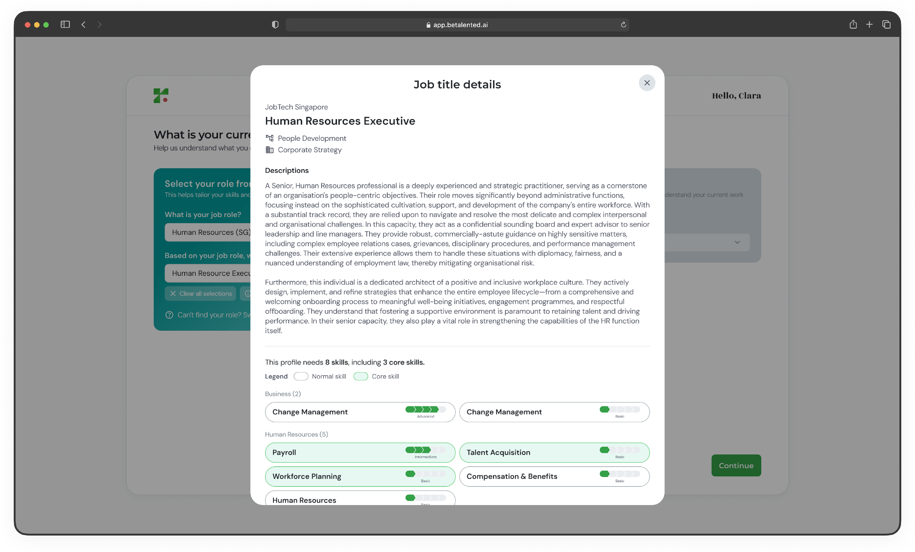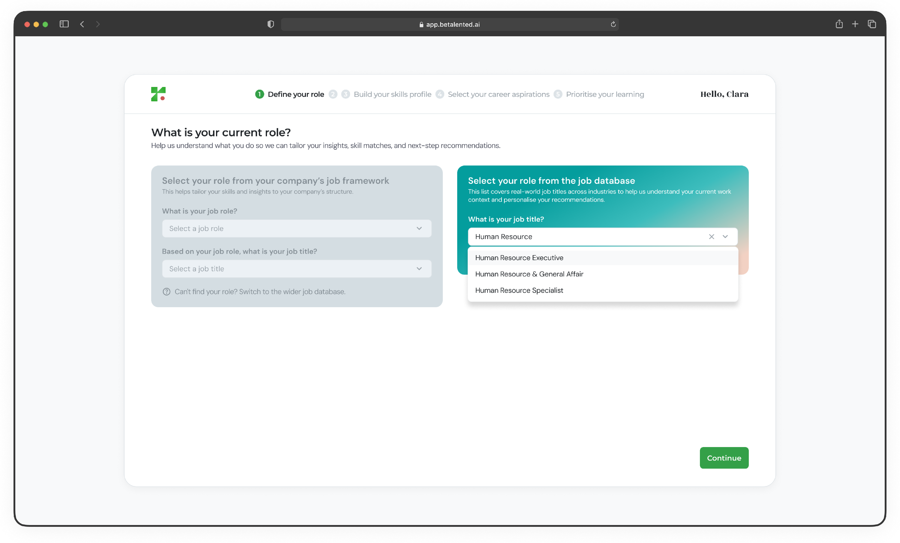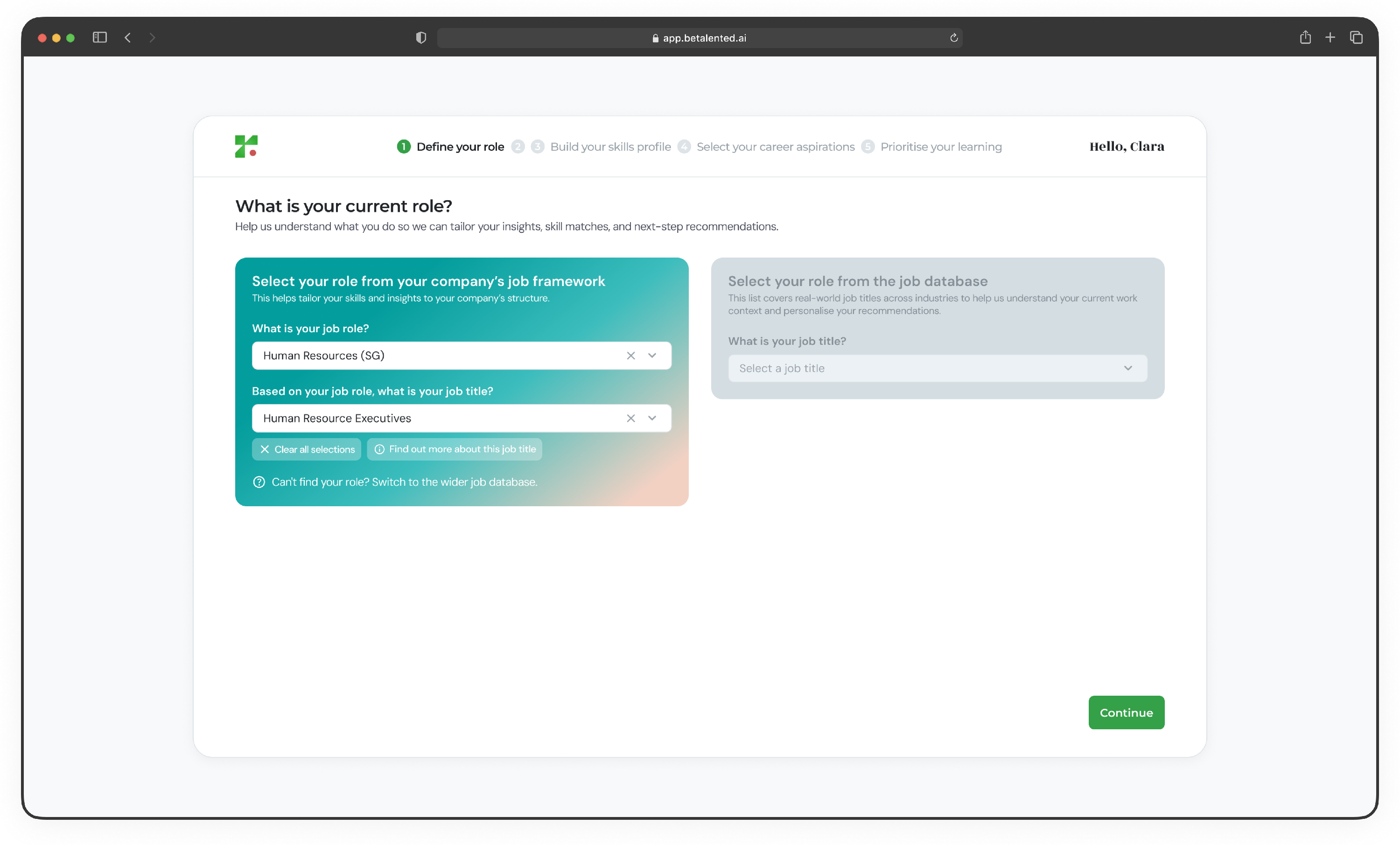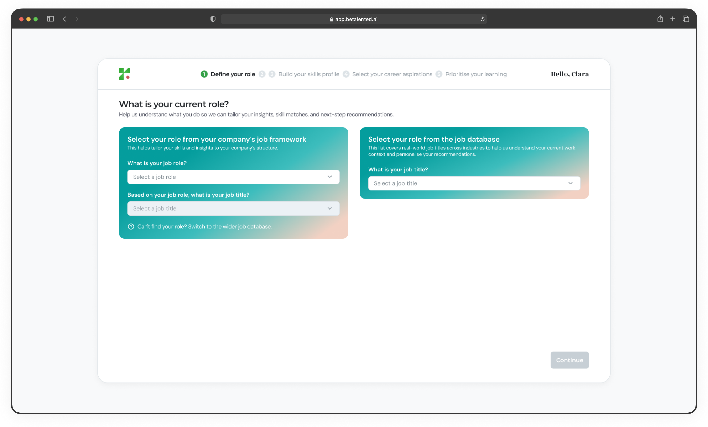 During onboarding, you will be asked to define your current role. This step allows the platform to understand your position within your organisation and generate accurate skill and career recommendations.